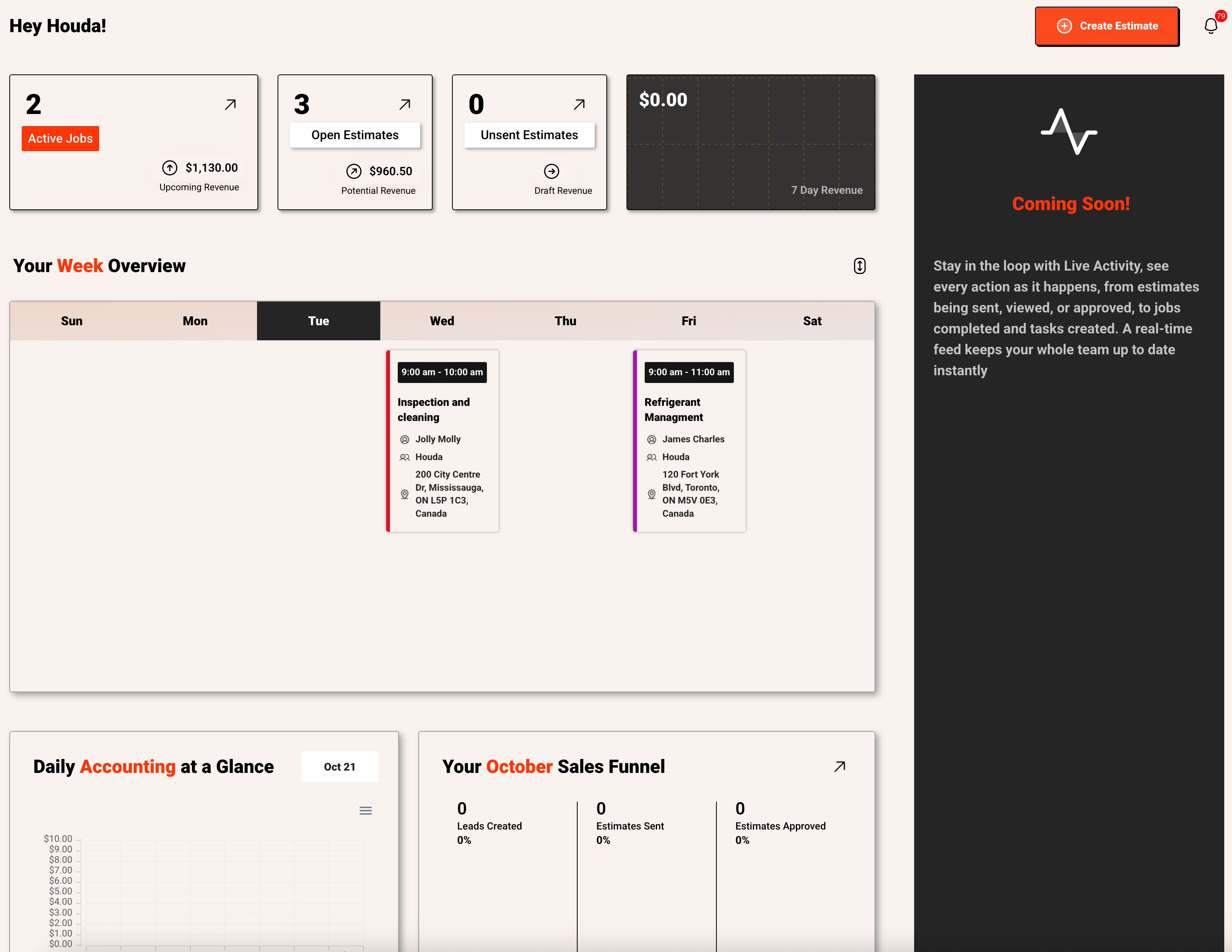 We’ve updated the Dashboard with a fresh new look designed to make navigation easier and more intuitive. You can now track key analytics at a glance, including revenue for the past 7 days through a clear graph, daily accounting, and your monthly sales funnel. The Dashboard also gives you a full-week view of events, along with an overview of how many jobs are currently active, how many estimates are open, and how many haven’t been sent yet. These improvements give you a complete snapshot of your business in one place, making it easier to stay on top of operations.